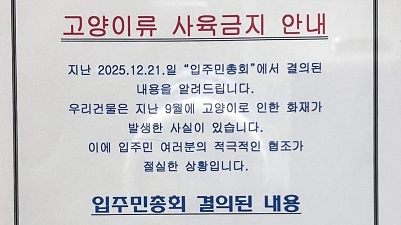 또 공지문을 통해 "고양이류를 키우는 세대는 인덕션 안전 커버를 씌워야 한다"며 "꼭 고양이를 키워야 하는 세대는 다른 곳으로 이사할 것을 정중히 요청한다"고 알렸습니다.