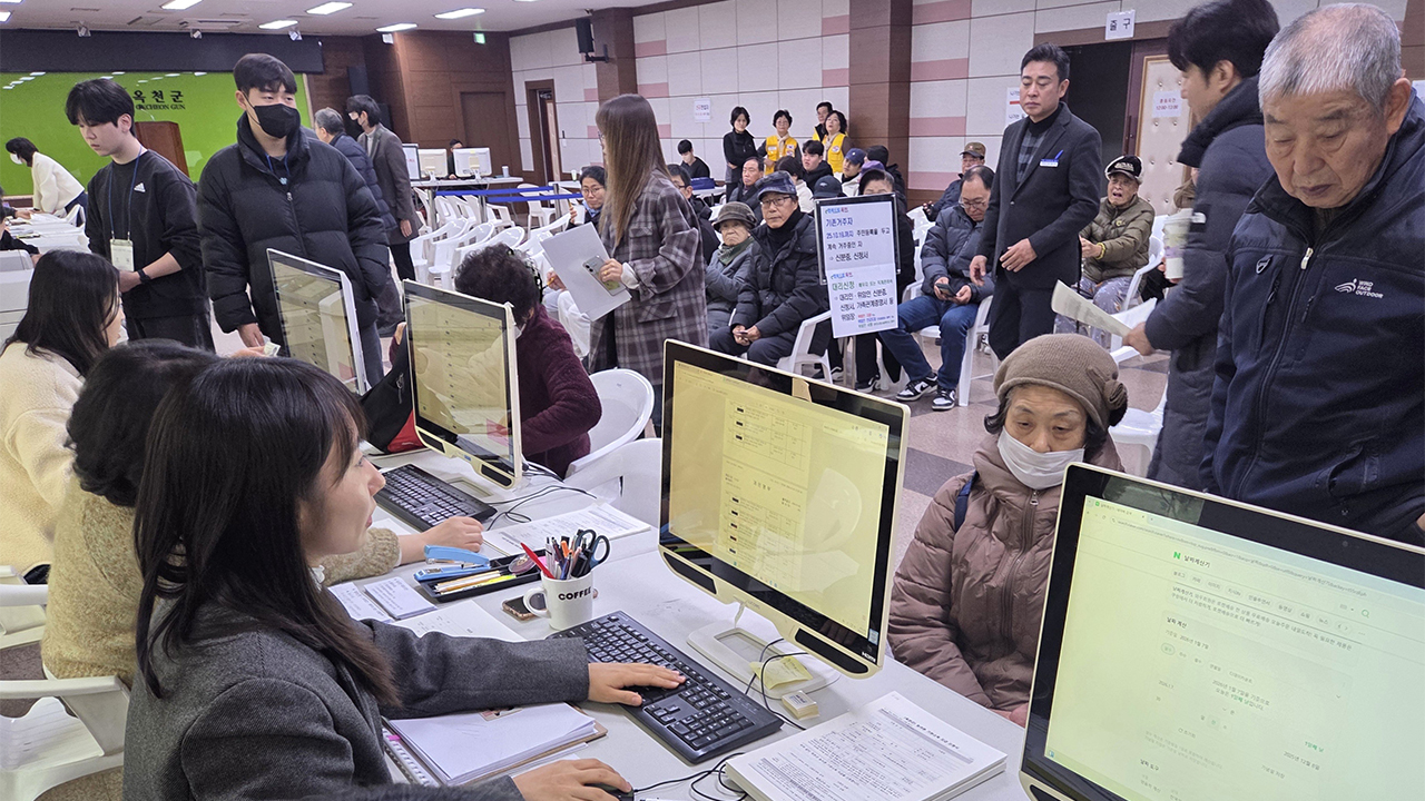 옥천군은 오늘 1천 명 이상 방문할 것에 대비해 접수대 14개를 설치하고 공무원을 전진 배치해 주민들의 신청을 도왔습니다.