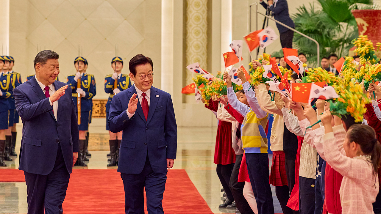 ▲ 이재명 대통령과 시진핑 중국 국가주석이 지난 5일 베이징 인민대회당에서 열린 이 대통령 공식환영식이 끝난 뒤 어린이들을 향해 손을 흔들고 있다.