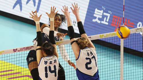 ▲ 7일 오후 경북 김천실내체육관에서 열린 여자 프로배구 현대건설 힐스테이트 와 한국도로공사 하이패스의 경기. 한국도로공사 모마가 공격을 시도하고 있다.