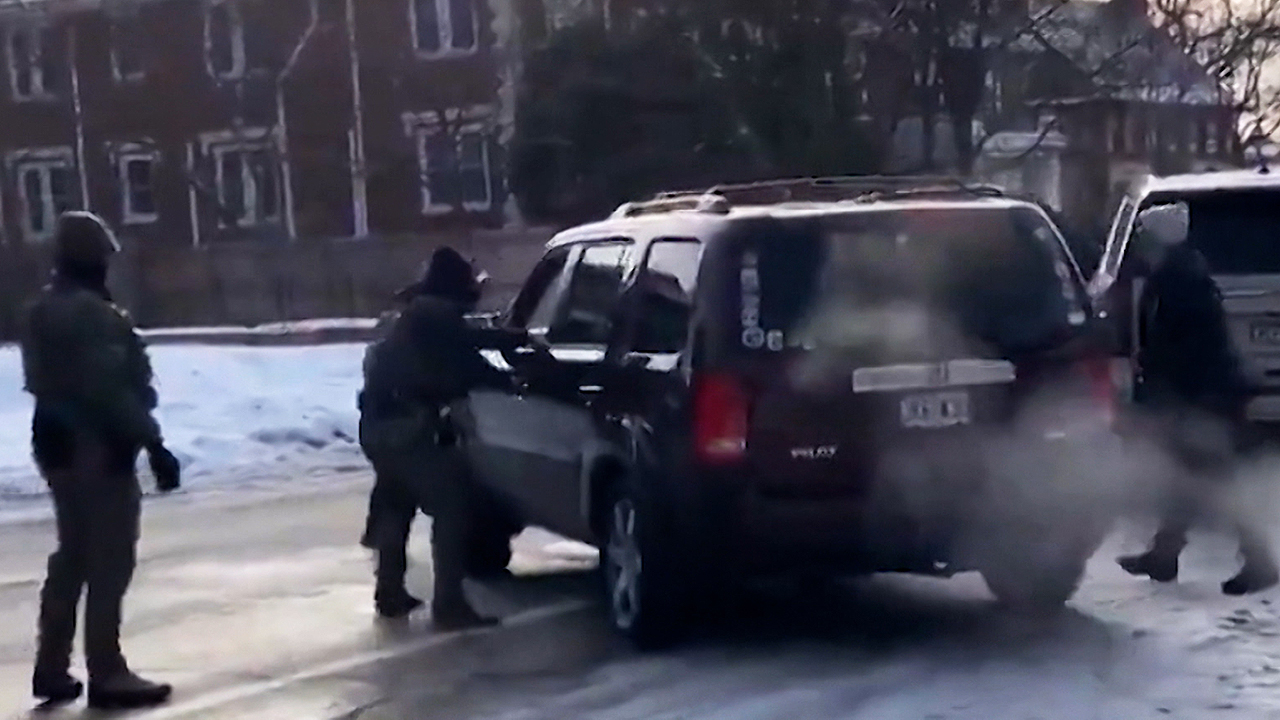 이민단속국 차 앞에 직각으로 멈춰선 짙은 갈색 SUV에 요원들이 접근합니다.