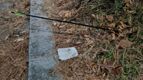 ▲ 7일 자정께 청주 상당구 청소년광장에서 강아지와 함께 산책 중이던 50대 여성을 향해 날아든 화살이 땅바닥에 박혀 있는 모습.