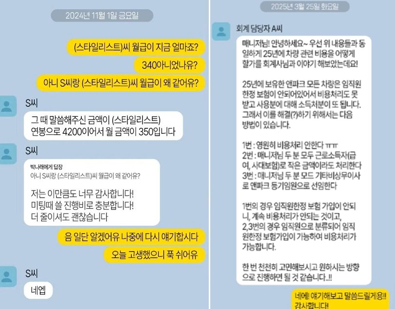 But in the KakaoTalk messages shared in the video, Park is seen asking why A’s pay was “similar to the stylist’s” and suggesting she should earn more. A responds that she’s “already grateful” and that the current amount is enough to cover meeting expenses―adding she’d be fine with even less. The exchange appears to conflict with A’s claim that she was shorted on an agreed-upon salary.