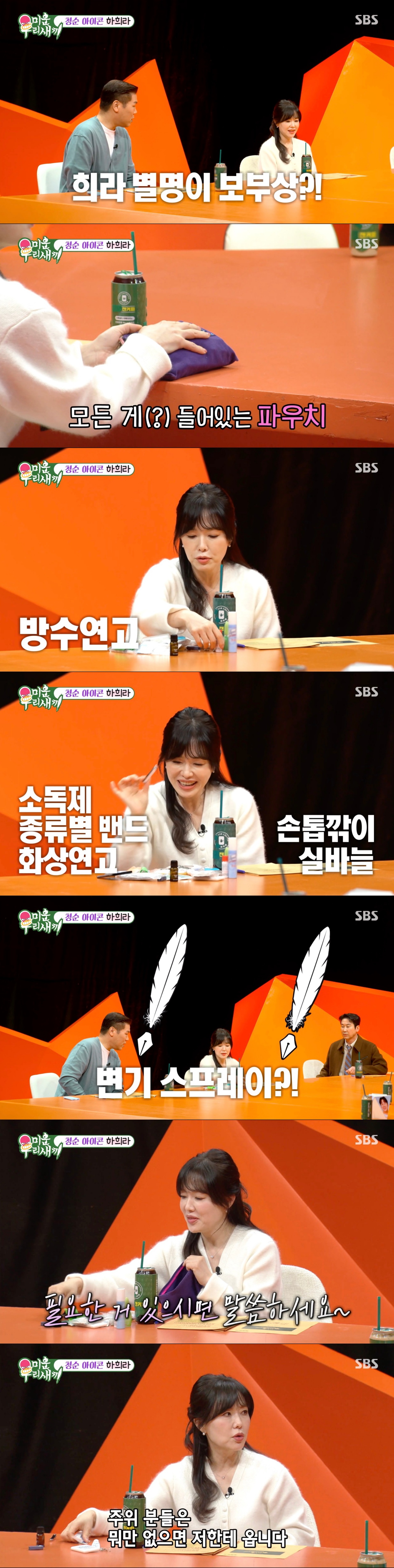 하희라가 자신의 파우치 속 아이템을 공개했다.