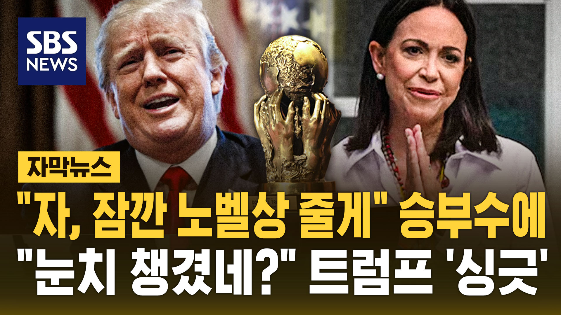 마차도가 '노벨상 공유'라는 카드까지 꺼내 든 배경에는 노벨평화상에 대한 열망을 노골적으로 드러내왔던 트럼프 대통령의 환심을 사기 위해서란 분석이 나옵니다.