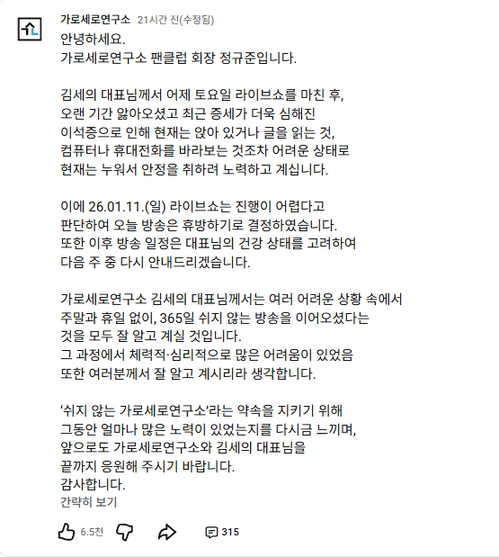 가세연 팬클럽 회장 정 모 씨 명의로 지난 11일 유튜브 채널 '가세연' 커뮤니티에 공개된 공지에 따르면 김세의 대표는 "오랜 기간 앓아온 이석증 증세가 최근 급격히 악화돼 앉아 있거나 글을 읽는 것, 컴퓨터·휴대전화를 보는 것조차 어려운 상태"라며 "부득이하게 11일 라이브 방송을 휴방한다"고 밝혔다. 공지에는 "현재는 누워서 안정을 취하고 있다"는 설명과 함께, 향후 방송 일정은 건강 상태를 고려해 추후 안내하겠다는 내용이 담겼다.