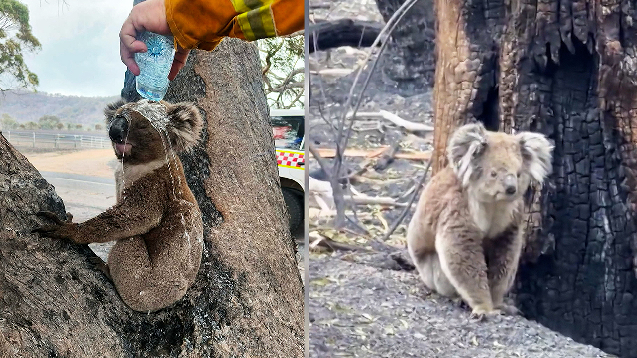 기진맥진한 코알라에게 소방관이 물을 뿌려주고 있습니다.
