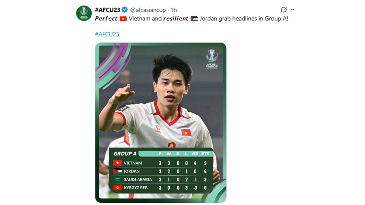 ▲ 베트남이 A조 1위로 대회 8강에 오른 소식을 전한 AFC.
