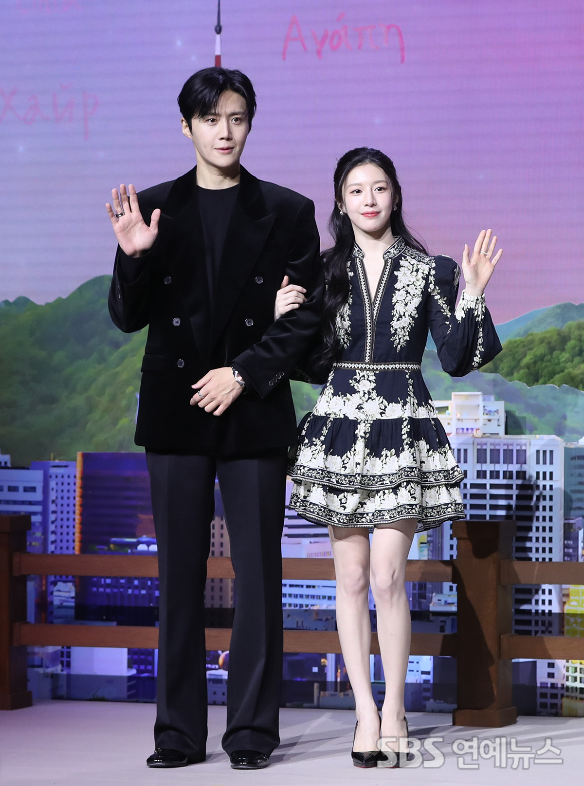 Actors Kim Seon-ho (left) and Go Youn-jung stepped onto the photo line at Josun Palace in Gangnam, Seoul, on the morning of Jan. 13 during the press conference for Netflix's "Can This Love Be Translated?".
