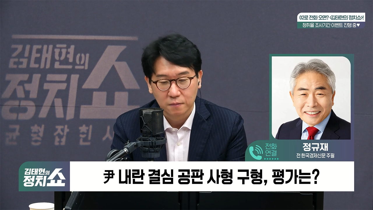 ▷김태현 : 윤석열 전 대통령의 내란 우두머리 혐의에 대해서 특검이 사형을 구형했는데요. 이번 구형이 과연 어떤 의미를 가지는 것인지 정규재 전 한국경제 주필과 짚어보도록 하겠습니다. 전화로 연결돼 있습니다. 주필님, 안녕하세요.