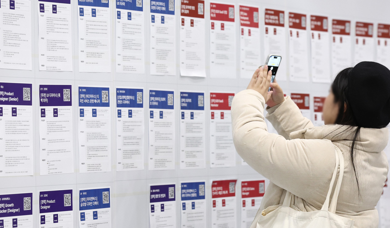 ▲ 11일 서울 강남구 코엑스에서 열린 '2026 스타트업 채용박람회'를 찾은 구직자가 채용공고 게시대를 살펴보고 있다.