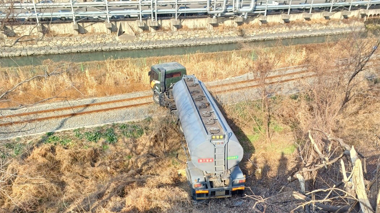 이 사고로 탱크로리 차량은 약 5m 높이에서 도로 옆 철길로 추락했습니다.