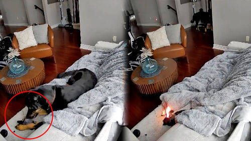 갑자기 연기가 피어오르기 시작했고 반려견은 깜짝 놀라 씹던 것을 떨어뜨리고 황급히 자리를 벗어납니다.