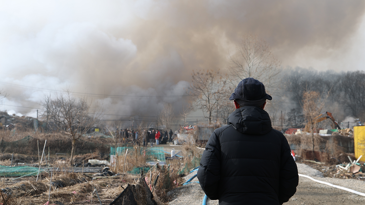 ▲ 16일 서울 강남구 개포동 구룡마을 4지구 화재현장 소방 통제선 밖에서 주민이 현장을 지켜보고 있다.