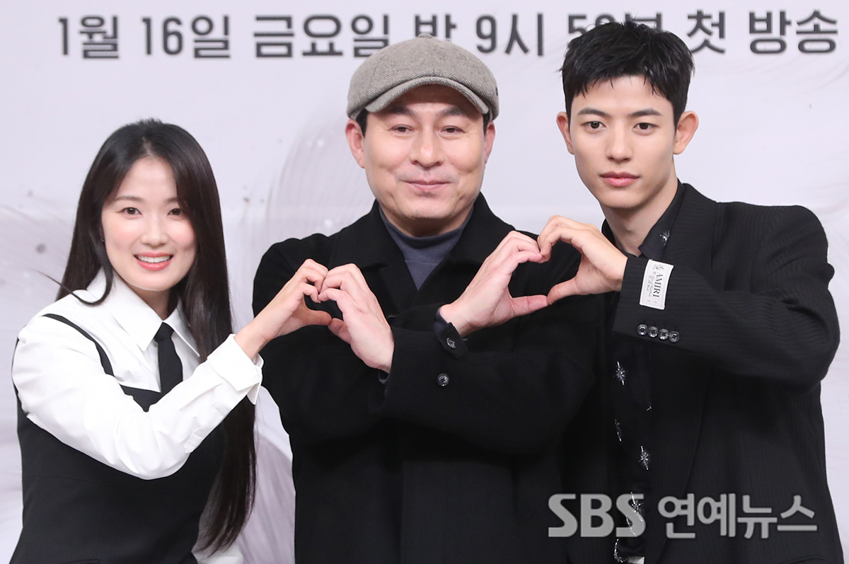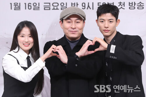 Kim Hyeyoon (from left), director Kim Jung-kwon, and Lomon hit the photo line during the press conference for SBS' new Friday-Saturday drama "No Tail to Tell" held at SBS headquarters in Mok-dong, Seoul, on Jan. 16.