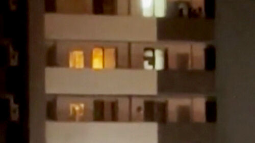 아파트 창문 사이로 시뻘건 불길이 보입니다.