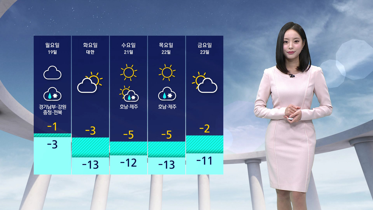 내일 새벽부터 오전 사이 서울을 제외한 일부 중부와 전북을 중심으로 비나 눈이 내리겠고 다음 주는 한파가 길게 이어질 전망입니다.