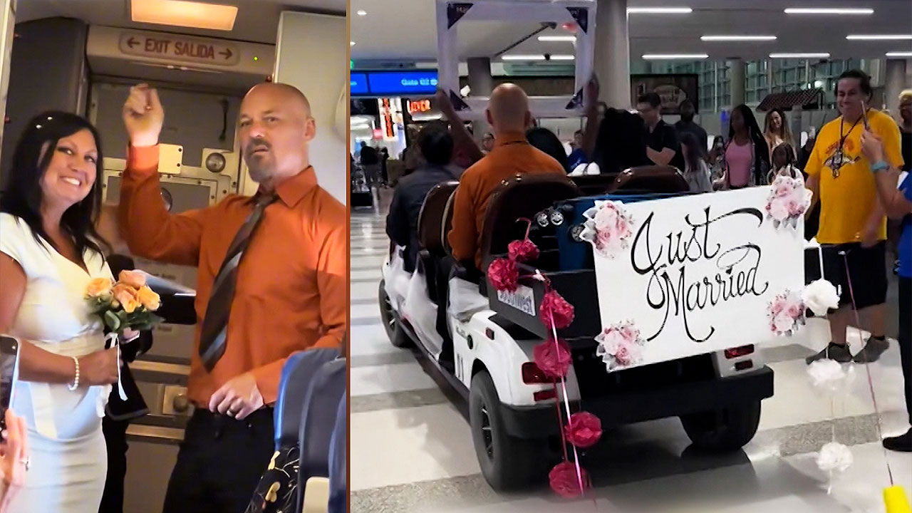 웨딩 장식이 된 게이트 통로는 물론이고 이들은 '방금 결혼했어요'라는 문구가 붙은 공항 카트를 타고 터미널까지 이동했다는데요.