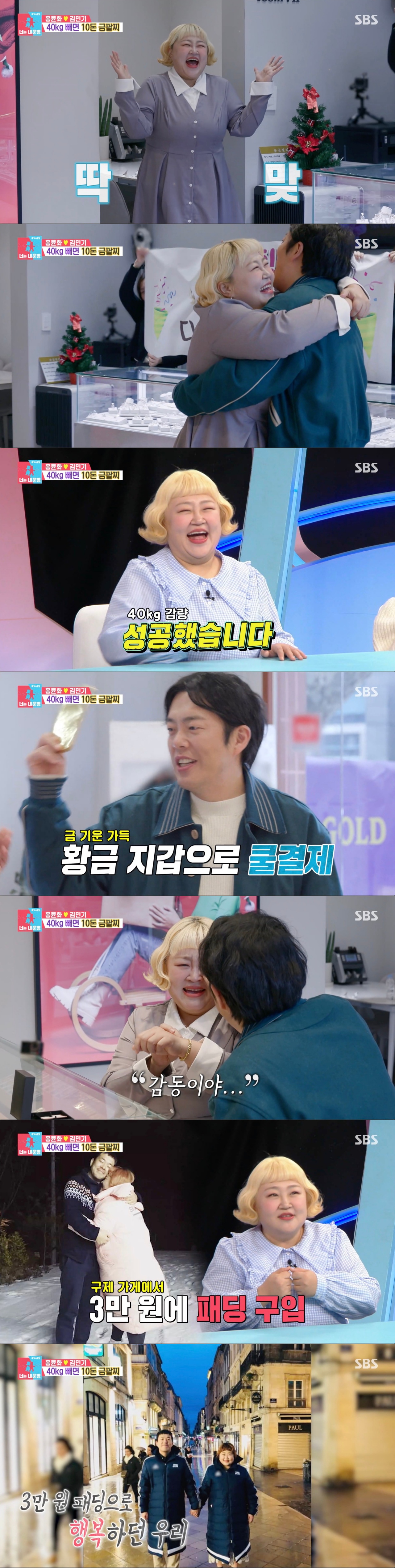 누구보다 홍윤화의 체중 감량에 기뻐하던 남편 김민기는 쿨하게 금팔찌를 결제했다. 이에 홍윤화는 "눈물 날 거 같아. 너무 감동이야"라며 감격했다. 그리고 "절대 안 팔고 오래오래 간직할게"라고 고마움을 전했다.