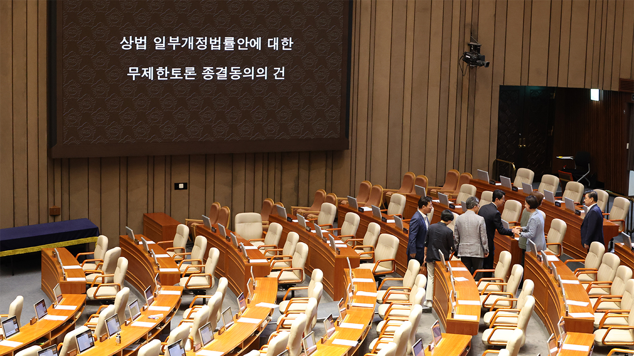 ▲ 지난해 8월 국회 본회의에서 상법 개정안에 대한 무제한토론 종결 동의의 건이 상정되자 마지막 토론자였던 주진우 의원을 비롯한 국민의힘 의원들이 본회의장에서 나가고 있다.