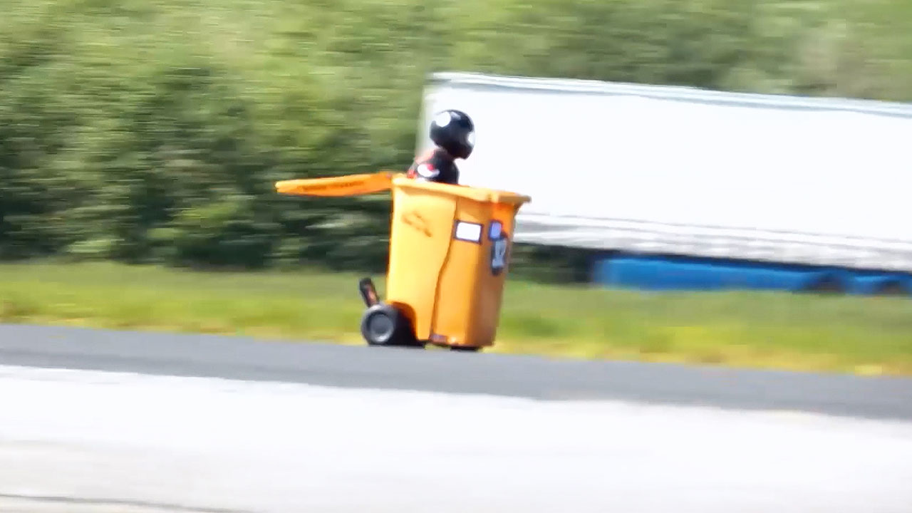 쓰레기통에 사람이 들어가 앉아있는 모습이 다소 웃음을 자아내지만, 속도는 장난이 아니네요.