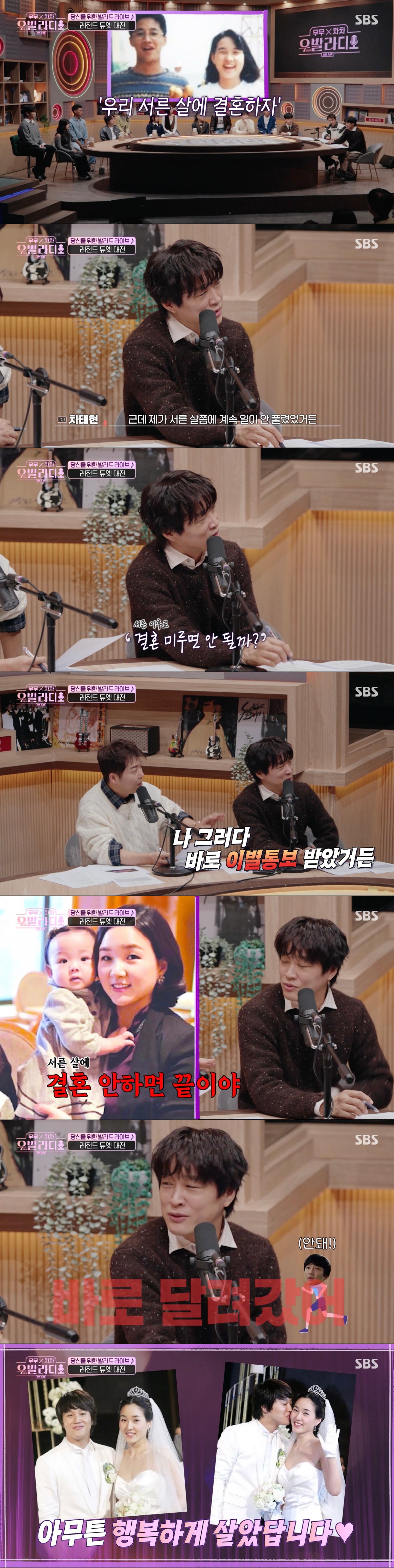이를 들은 차태현은 "내가 원래 서른 살에 결혼하려고 약속을 했었다. 그런데 서른 살 즈음에 계속 일이 안 풀렸다. 엽기적인 그녀 이후 계속 천천히 내려오던 시기였다"라고 당시를 떠올렸다.