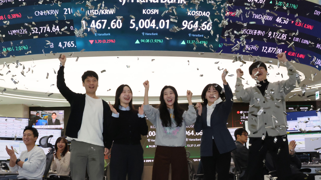 ▲ 코스피가 장중 5,000을 넘어선 가운데 22일 오전 서울 중구 하나은행 딜링룸에서 딜러들이 기뻐하고 있다.