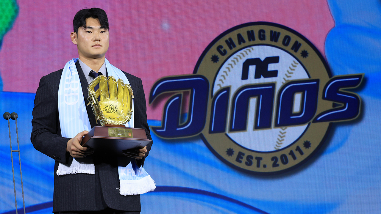 ▲ 2025컴투스프로야구 리얼 글러브 어워드에서 유격수 부문을 수상한 NC 김주원이 수상 후 기념사진을 촬영하고 있다.