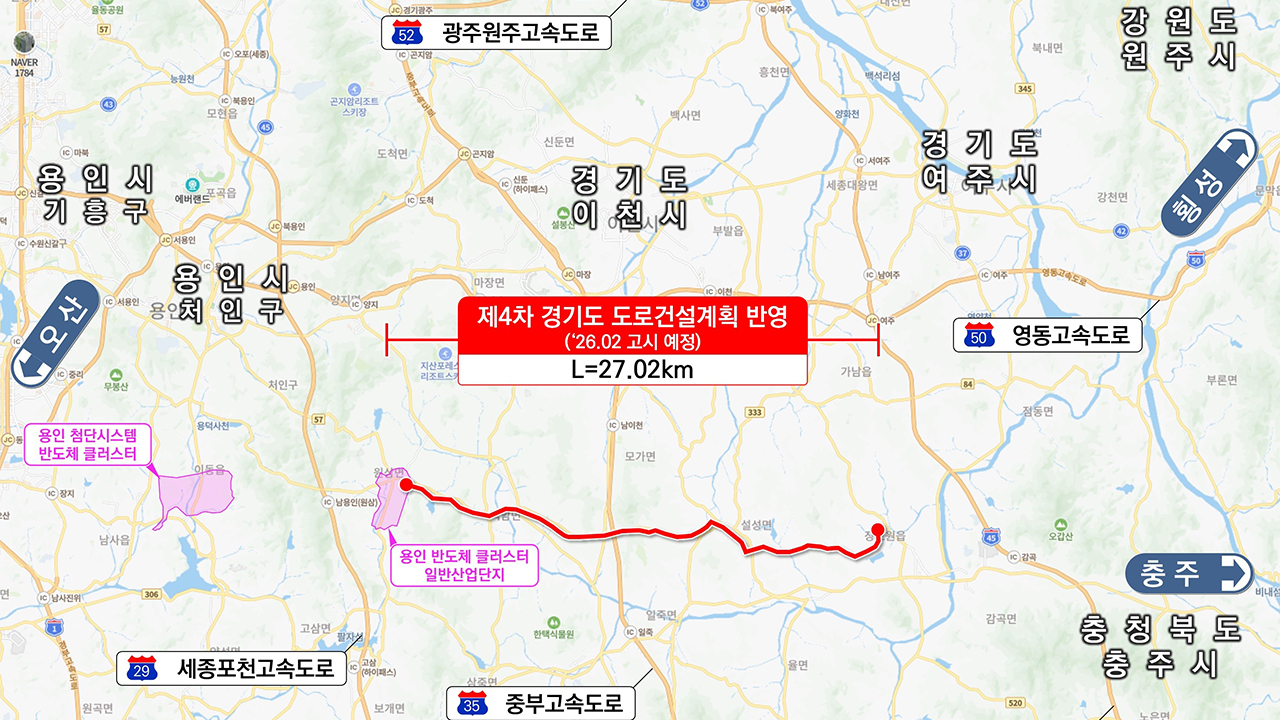협약에 따라 양측은 지방도 318호선 이천 대죽교차로(설성면 수산리)부터 용인 기상삼거리(처인구 원삼면 두창리)까지 27.02㎞ 구간의 도로 건설과 전력망 설치를 공동 시행하게 됩니다.