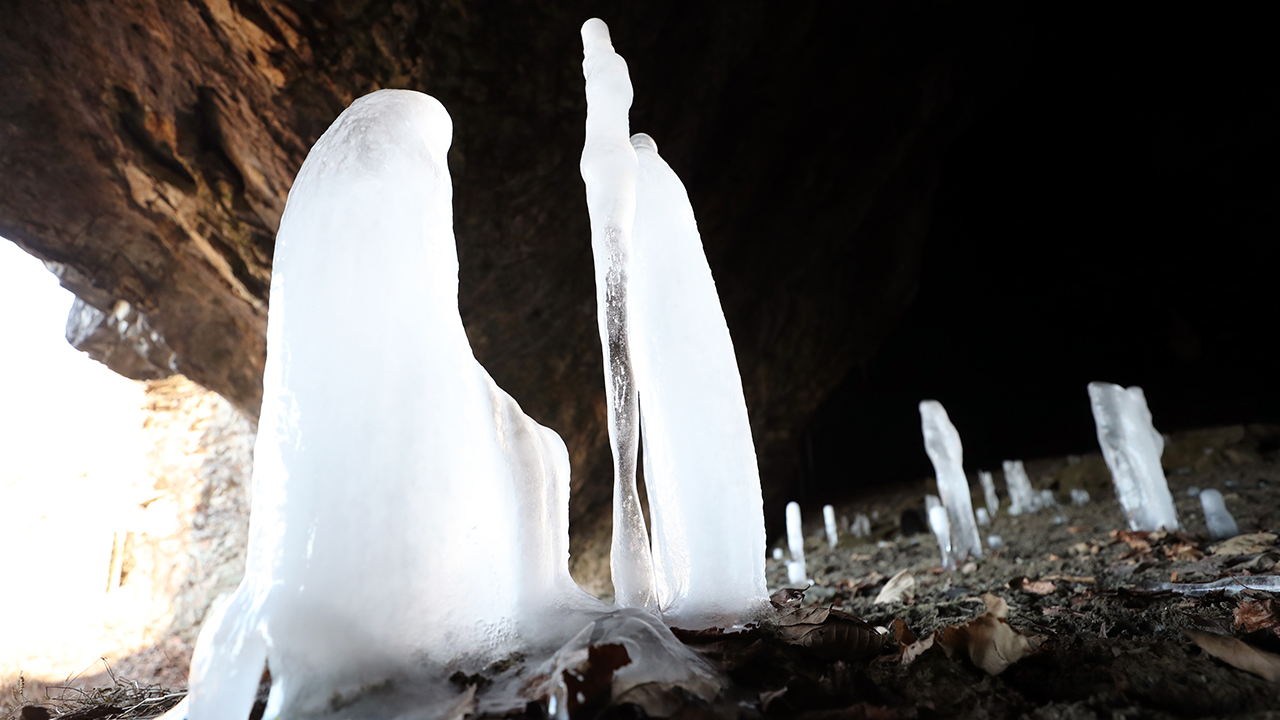 ▲ 22일 충북 제천시 덕산면 월악산 보덕암 인근 보덕굴에서 바닥의 물방울이 얼어 위로 자라난 역고드름이 동굴 안에 솟아 있다.