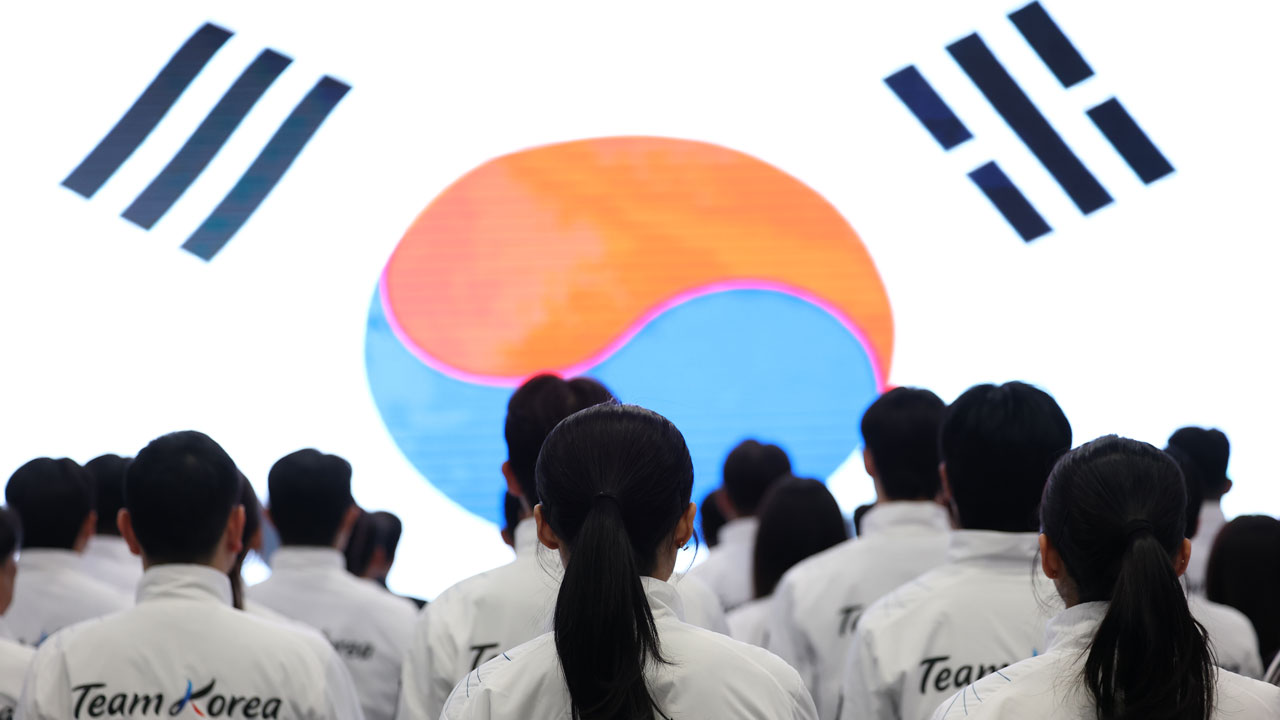 ▲ 지난 22일 송파구 올림픽파크텔에서 열린 2026 밀라노 동계올림픽 선수단 결단식에서 선수들이 국기에 경례하고 있다.