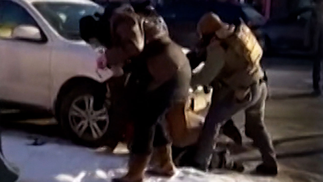 이민 단속 요원이 한 여성을 밀어서 쓰러트리자, 옆에 있던 남자가 막아섭니다.