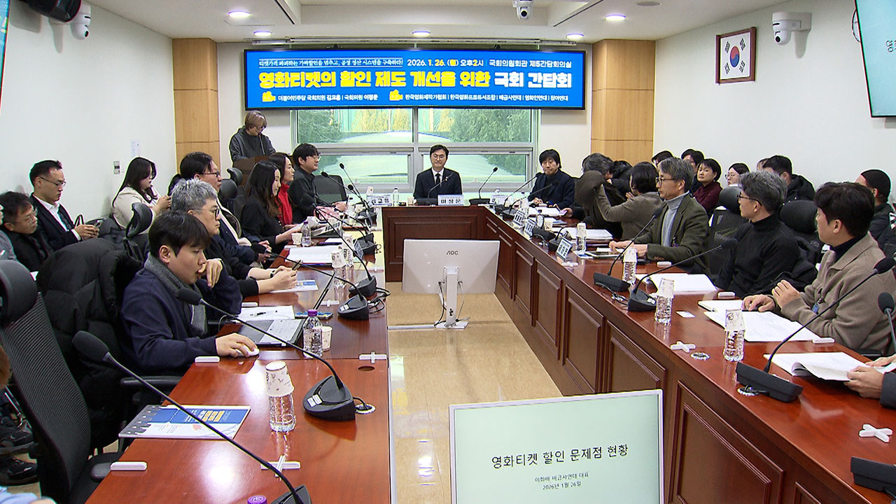 영화 제작 주체 의사와 상관없는 일방적인 영화 티켓 할인으로 한국 영화 산업의 기반이 흔들리고 있다고 주장하는 영화인연대 주관 간담회가 국회에서 열렸습니다.
