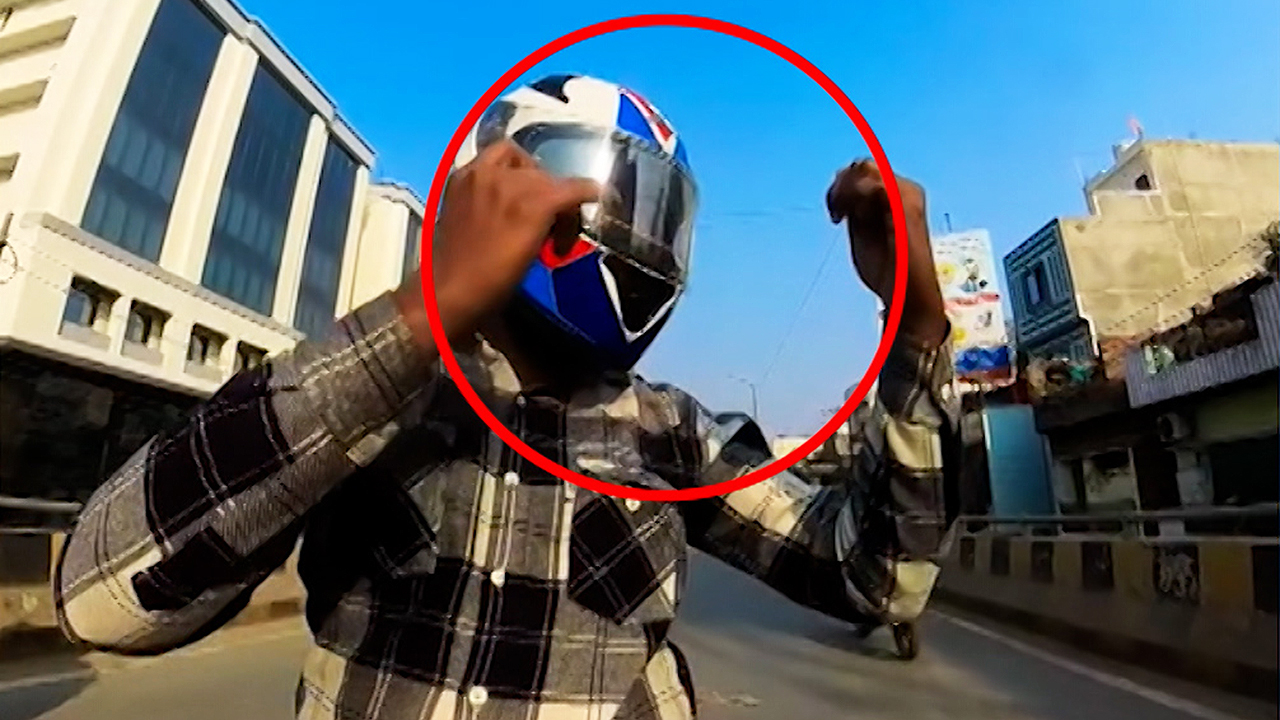 인도의 한 남성이 오토바이를 타고 달리다 뭔가 이상한 느낌에 우뚝 멈춰 섭니다.