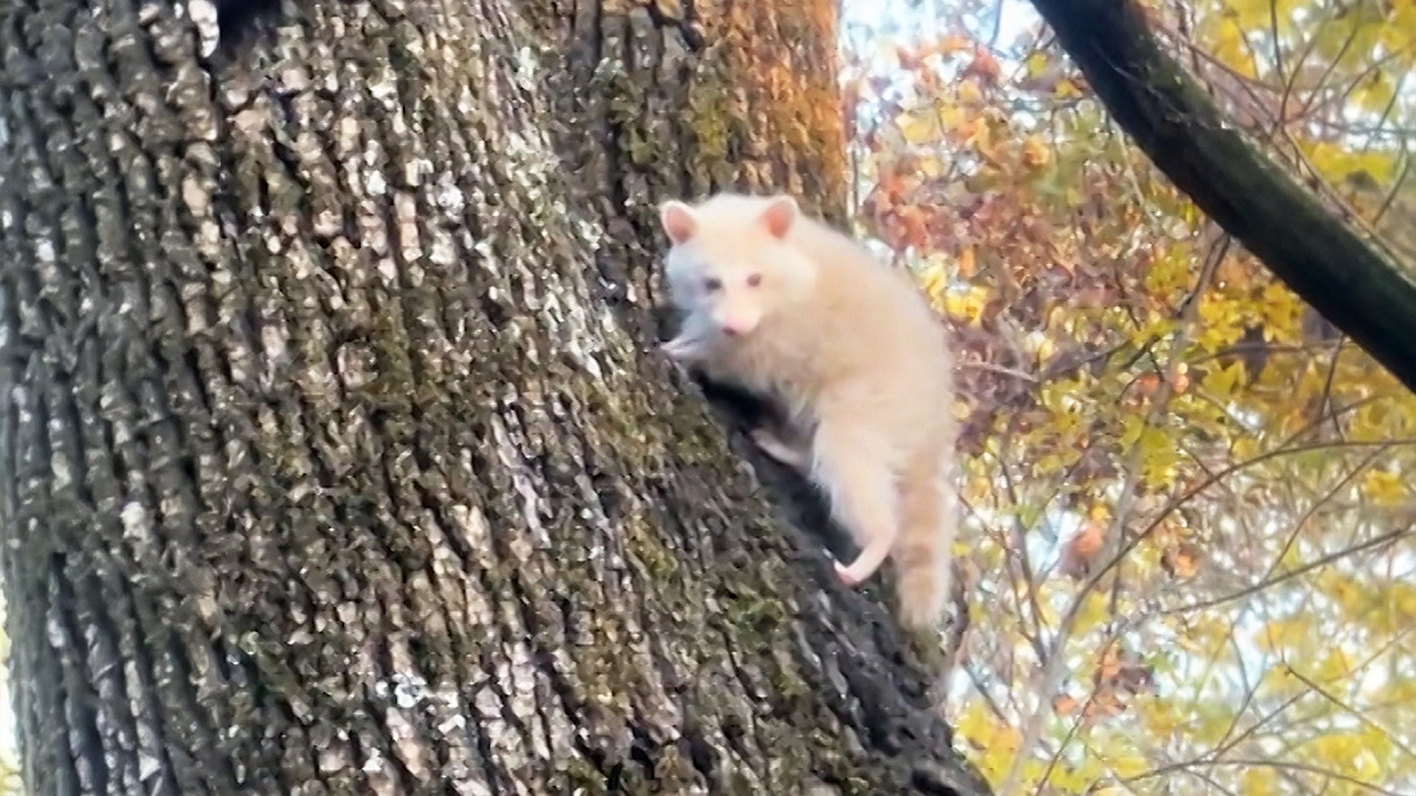 주변의 보통 라쿤과 비교하면 온몸의 흰 털이 더욱 확연히 눈에 띄죠.