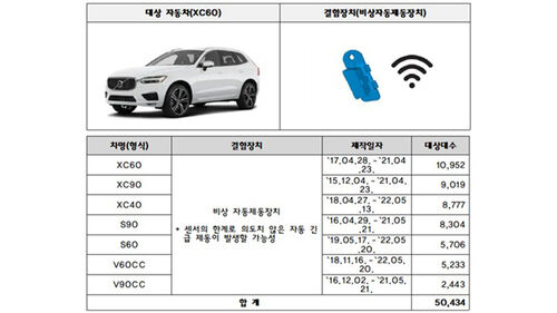 볼보 XC60 등 7개 차종 5만 434대는 비상 자동 제동장치 센서의 문제로 의도치 않은 자동 긴급 제동이 발생할 가능성이 있어 지난 26일부터 시정조치를 진행하고 있습니다.