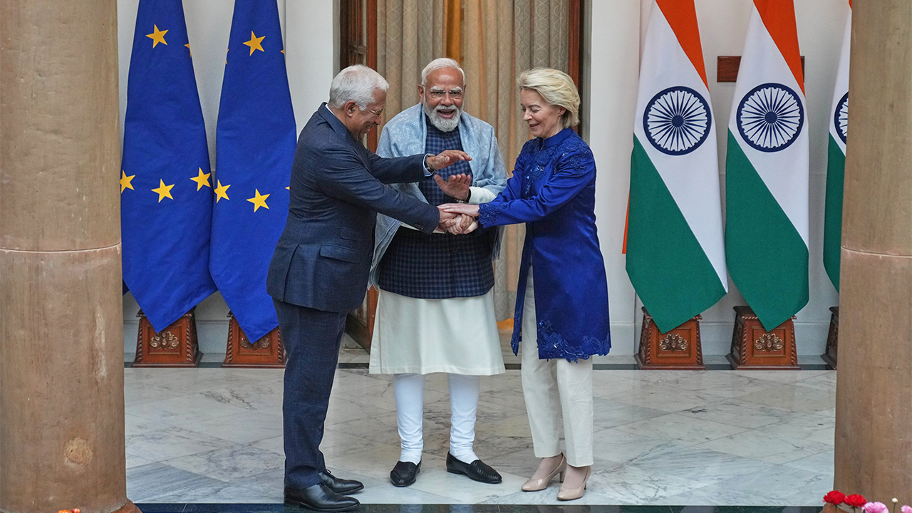 ▲ (왼쪽부터) 안토니우 코스타 EU 정상회의 상임의장과 나렌드라 모디 인도 총리, 우르줄라 폰데어라이엔 EU 집행위원장