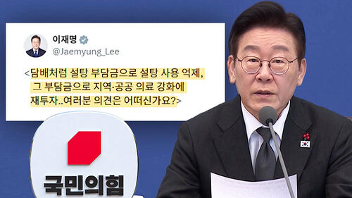 이재명 대통령이 어제(28일) SNS를 통해 설탕에 부담금을 부과해 지역·공공의료 재원으로 활용하면 어떻겠느냐는 화두를 던졌습니다. 국민의힘에서는 물가 상승만 초래할 거라며 다음에는 고혈압 예방을 위해 소금세를 도입할 거냐고 날을 세웠습니다.