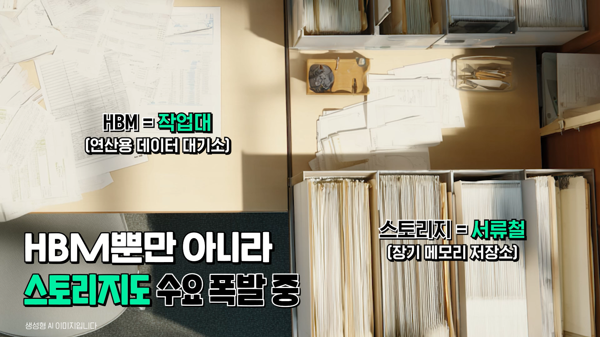 HBM이 GPU의 연산 과정을 도와주는 작업대 역할로서 수요가 급증한다면 저장소 역할의 메모리도 수요가 늘어나고 있습니다. 이를테면 과거에 자료들을 담아두고 필요할 때 꺼낼 수 있는 공간, 스토리지에 대한 수요도 급증하는 거죠.