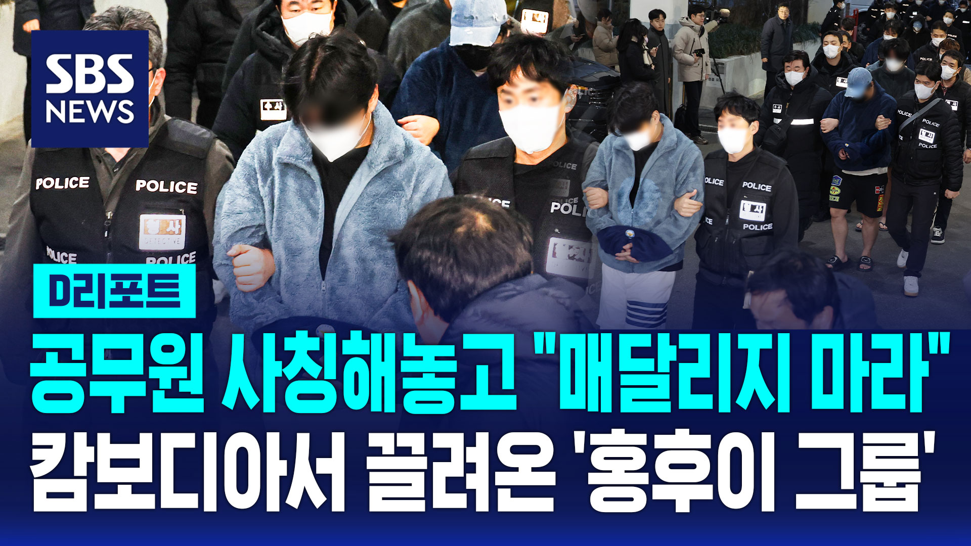 캄보디아 현지 공항에서 반팔 옷에 슬리퍼 차림인 피의자들이 줄줄이 비행기에 몸을 싣습니다.