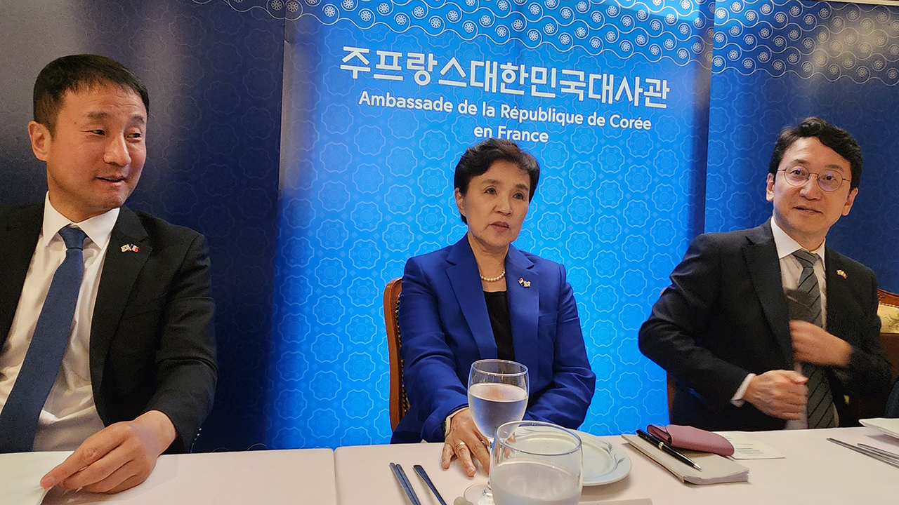 ▲ 강금실 전 법무부 장관을 단장으로 하는 대통령 프랑스 특사단이 현지 시간 지난해 7월 17일 파리에서 현지 특파원들과 만나 프랑스 관계자들과의 면담 내용을 설명하고 있다.
