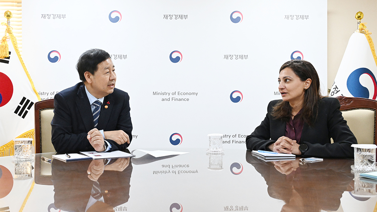 ▲ 구윤철 부총리 겸 재정경제부 장관이 지난 29일 서울 종로구 정부서울청사에서 연례협의차 방한한 국제신용평가사 무디스 연례협의단의 예방을 받고 아누슈카 샤 아태 지역 국가신용등급 담당 이사와 면담하고 있다.
