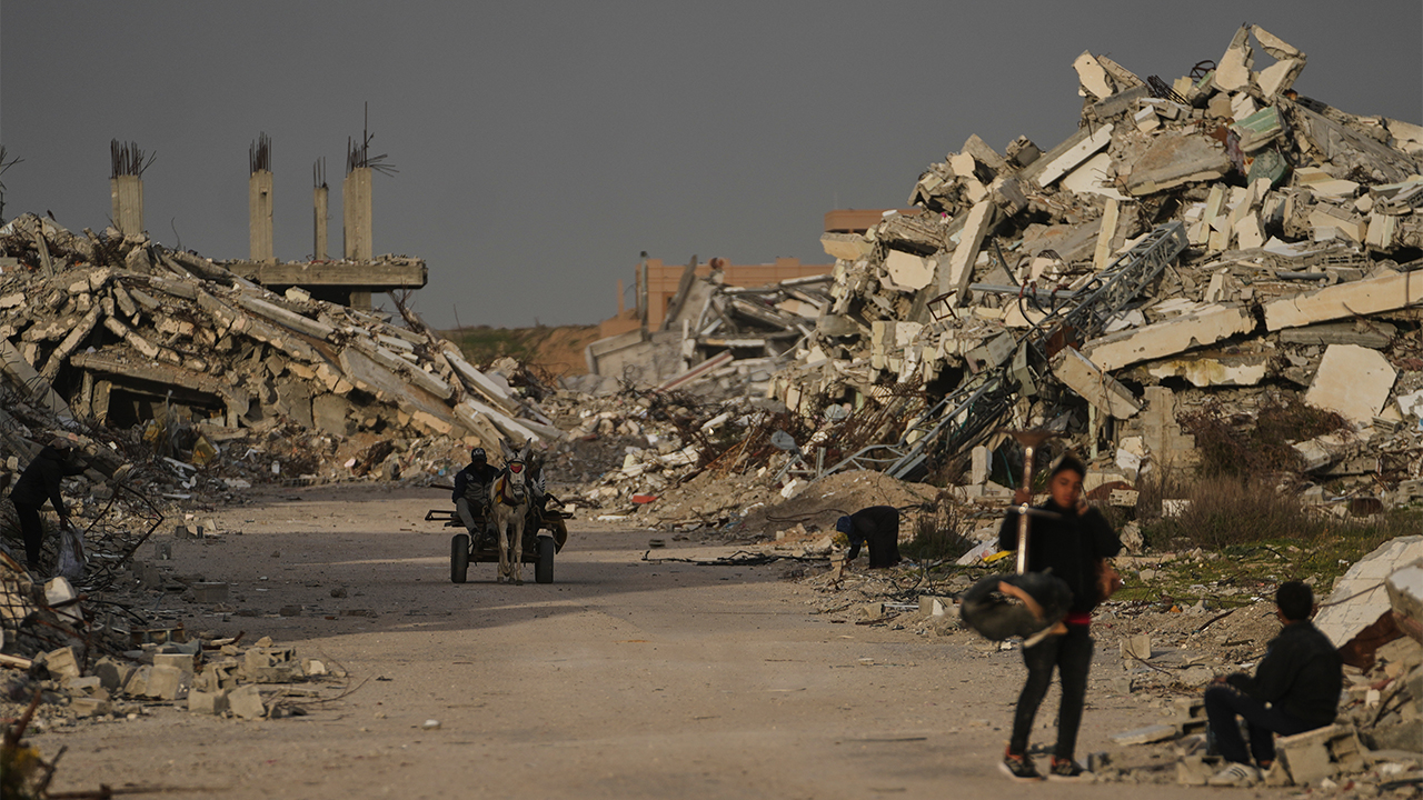 ▲ 현지 시간 28일 팔레스타인 사람들이 폐허가 된 가자지구를 걷고 있다.