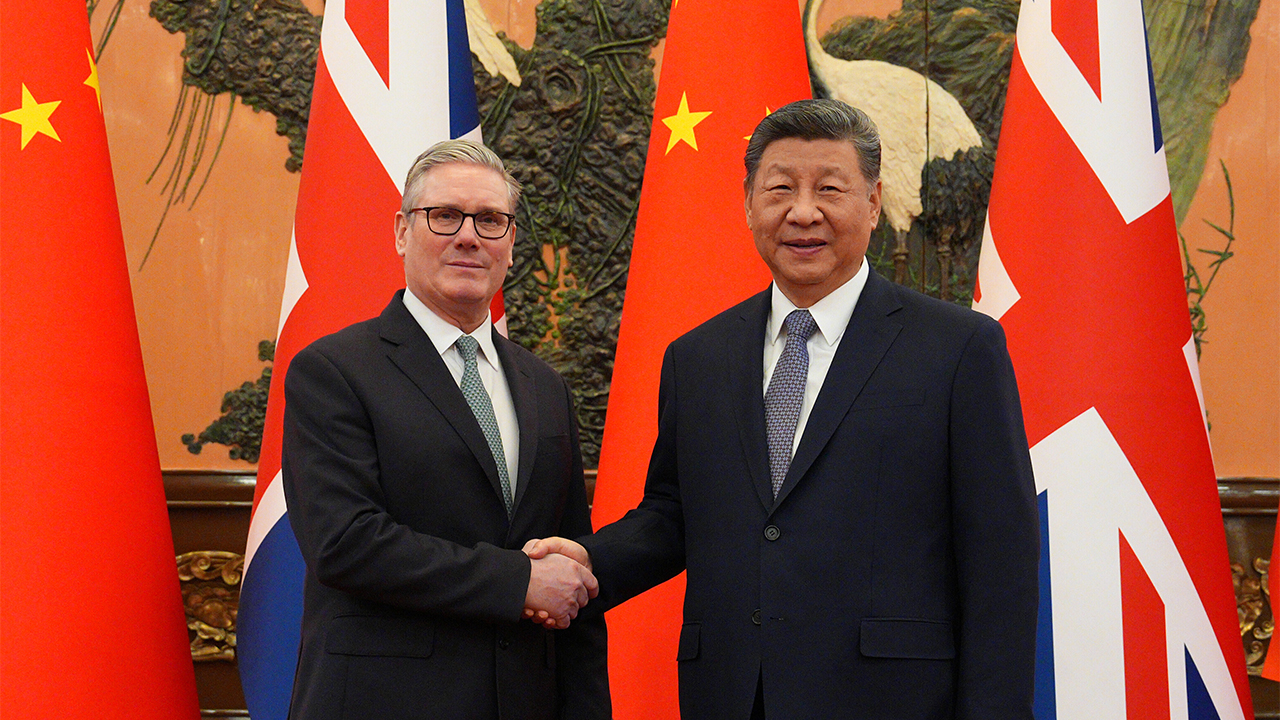 ▲ 중국을 방문한 키어 스타머(사진 왼쪽) 영국 총리와 시진핑 중국 국가주석이 1월 29일 베이징 인민대회당에서 진행된 정상회담에 앞서 악수하고 있다.