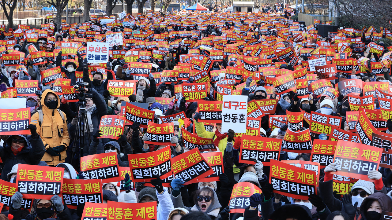 국민의힘이 한동훈 전 대표를 제명한 이후 첫 주말인 오늘 한 전 대표 측 지지자들이 대규모 집회를 열고 장동혁 대표를 비롯한 지도부의 사퇴를 요구했습니다.