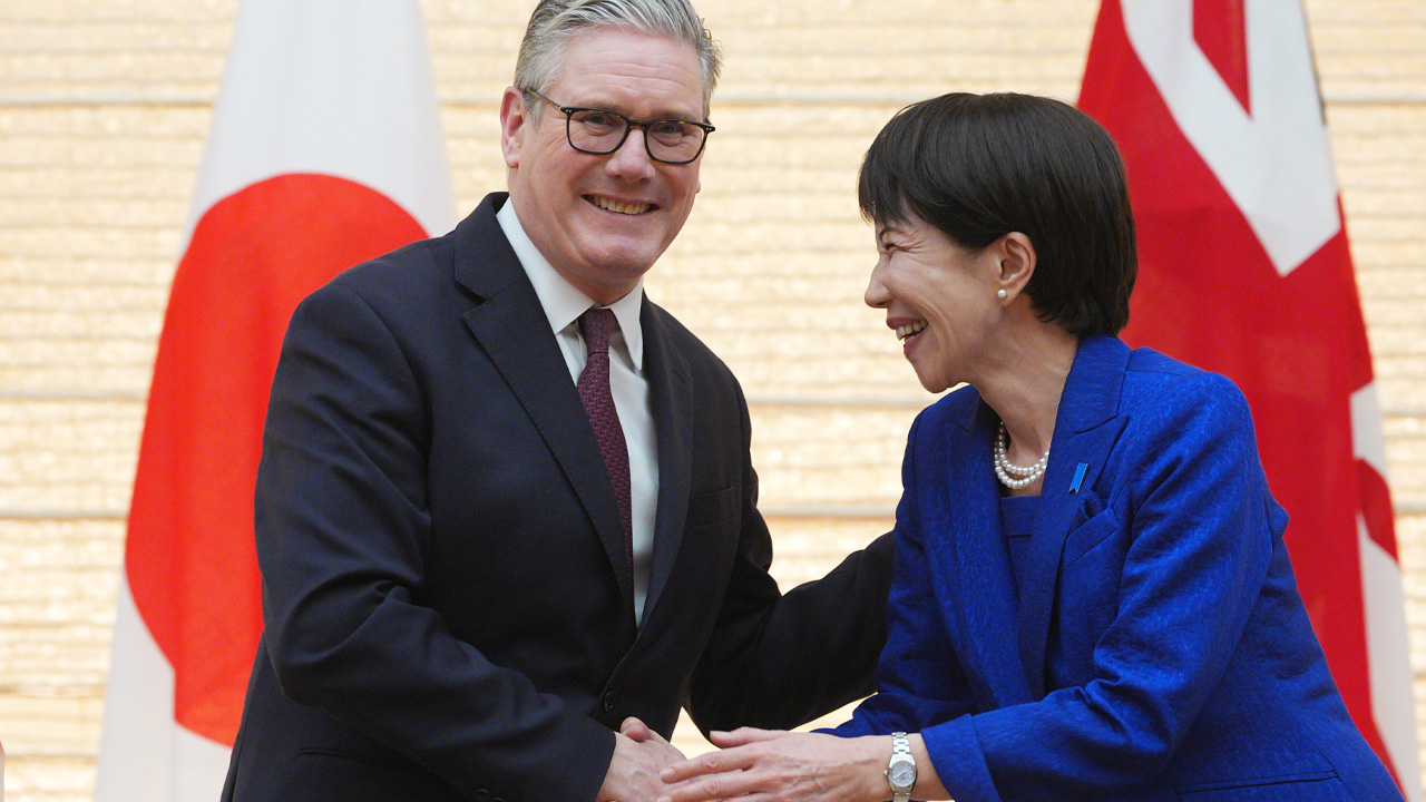 ▲ 다카이치 사나에 일본 총리와 키어 스타머 영국 총리가 31일 도쿄 총리 관저에서 악수하고 있다.
