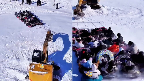 건설용 굴착기에 연결된 사슬이 회전하던 도중 갑자기 끊어지면서 탑승객들이 그대로 얼음판으로 튕겨 나갔습니다.