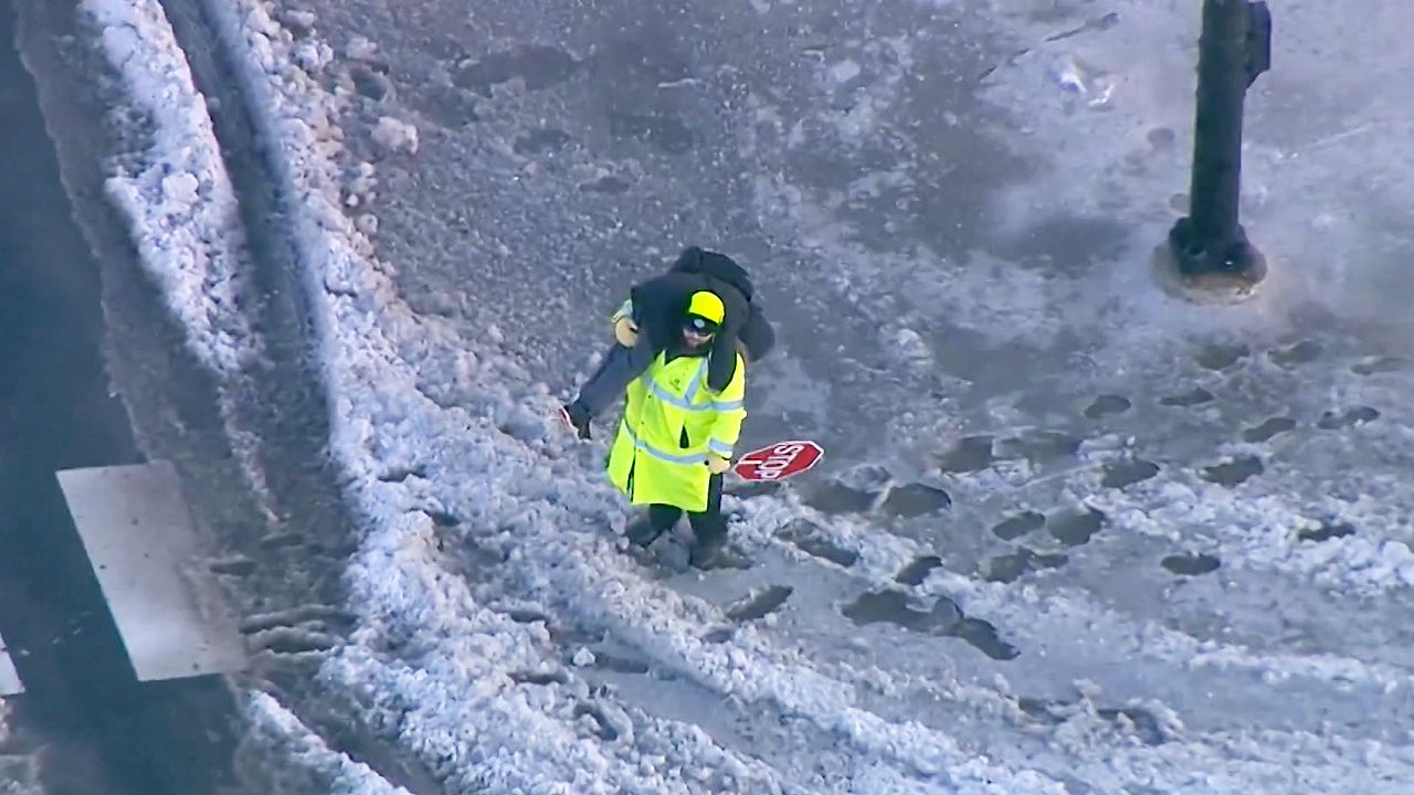 어린 학생이 도로에서 멈칫하며 서있자 한 안전요원이 정지 표지판을 든 채 다가옵니다.