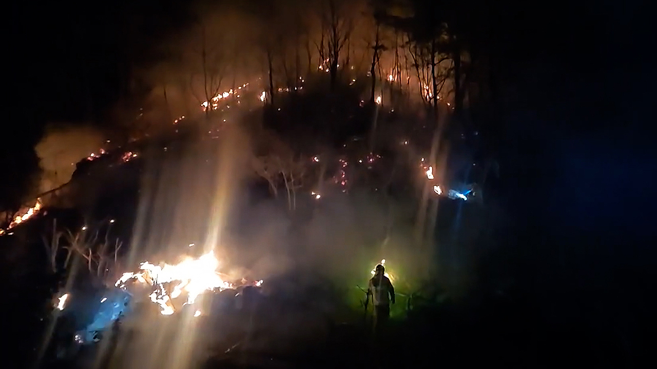 나무 사이 곳곳에서 불꽃이 일렁이고, 불을 끄러 나선 진화대원들은 조명으로 어두운 숲 속을 비춥니다.