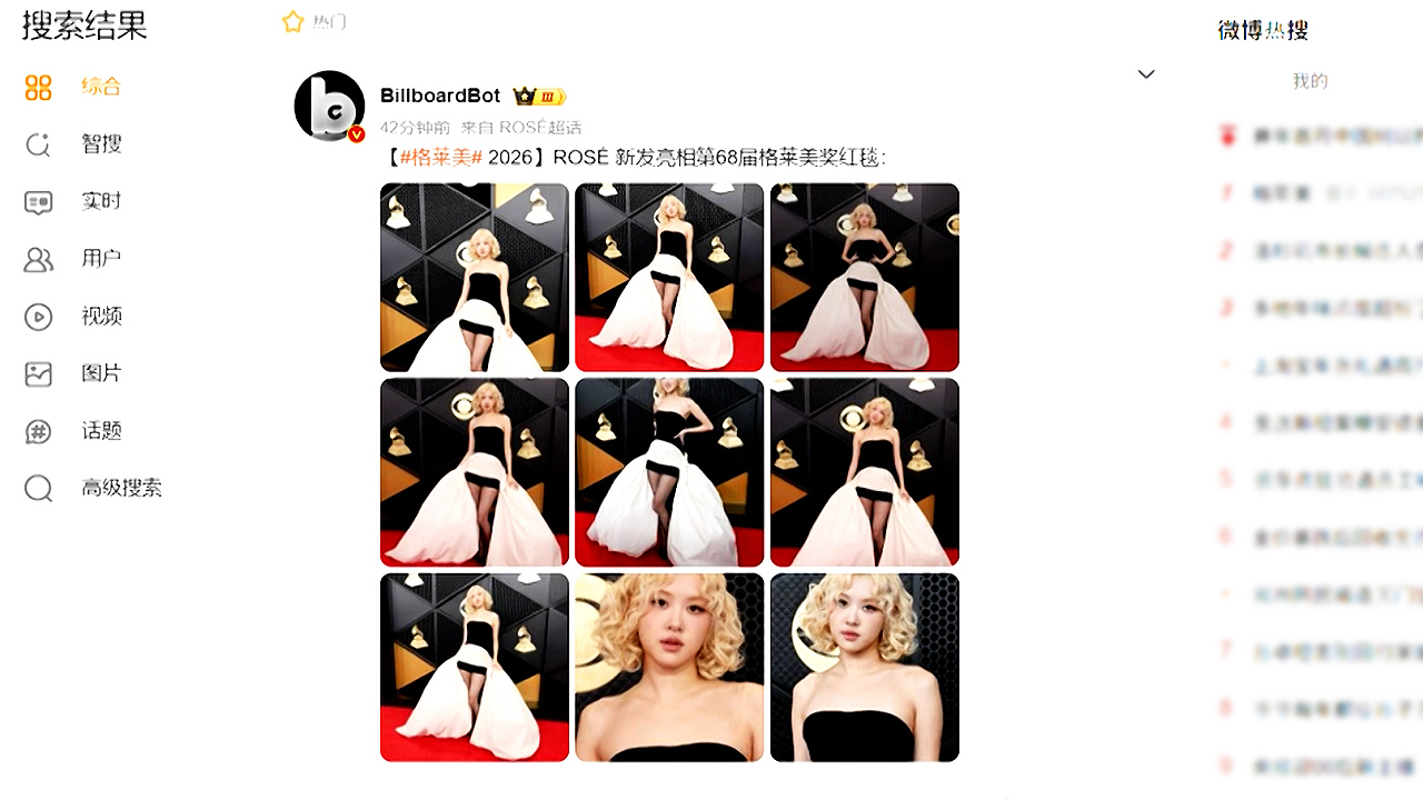 그래미상 사전 행사 소식을 실시간으로 전하며 밤새 중국 SNS 검색 순위 1위에 올랐습니다.
